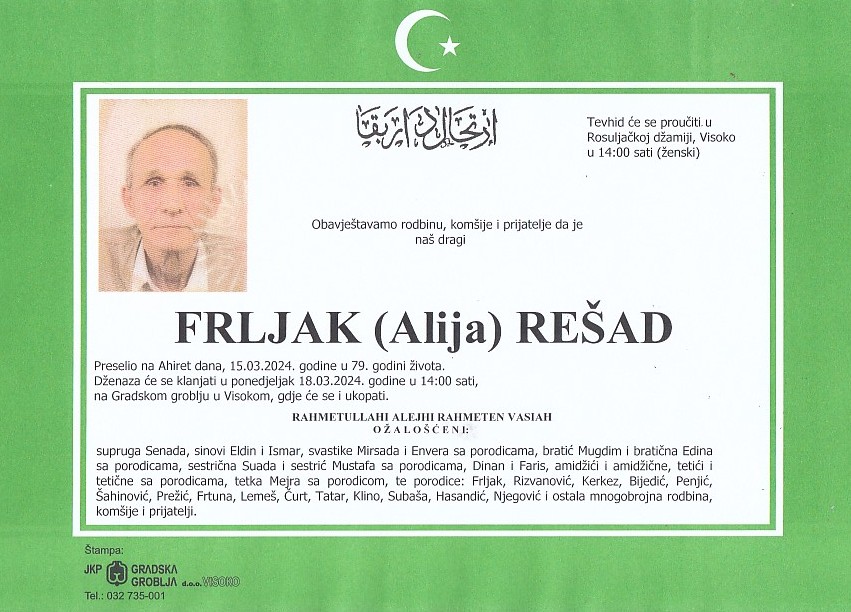FRLJAK (Alija) REŠAD 18.03.2024. godine u 14:00 sati