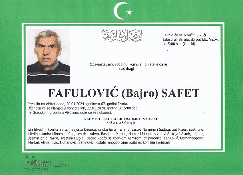 FAFULOVIĆ (Bajro) SAFET 22.01.2024. godine u 15:00 sati