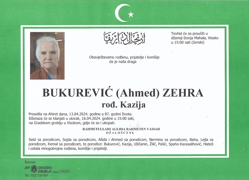 BUKUREVIĆ (Ahmed) ZEHRA 16.04.2024. godine u 15:00 sati