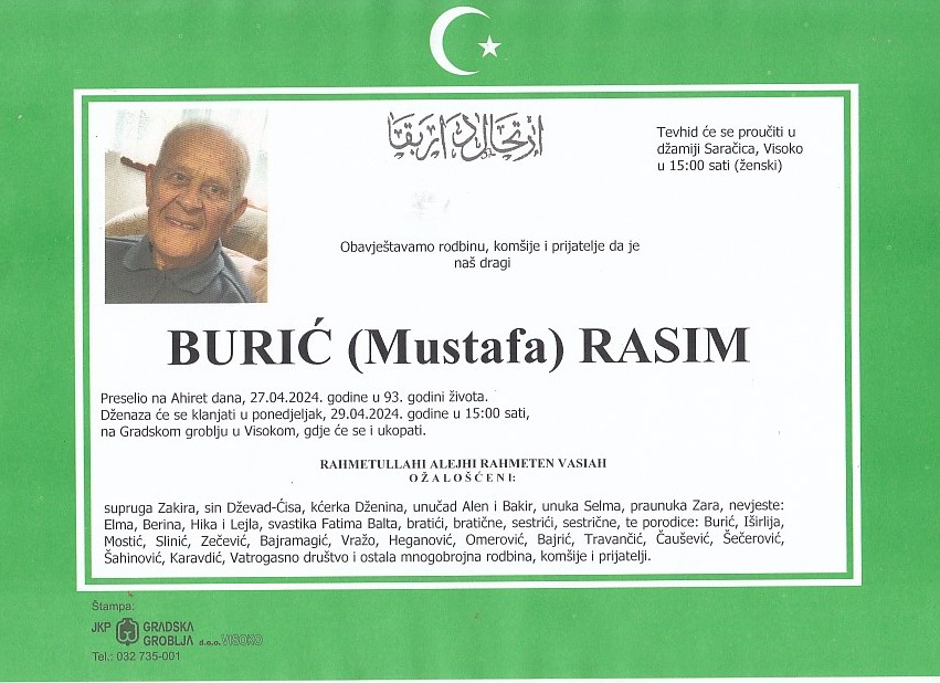 BURIĆ (Mustafa) RASIM 29.04.2024. godine u 15:00 sati