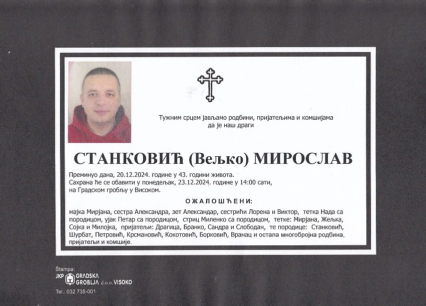 STANKOVIĆ (Veljko) MIROSLAV 23.12.2024. godine u 14:00 sati