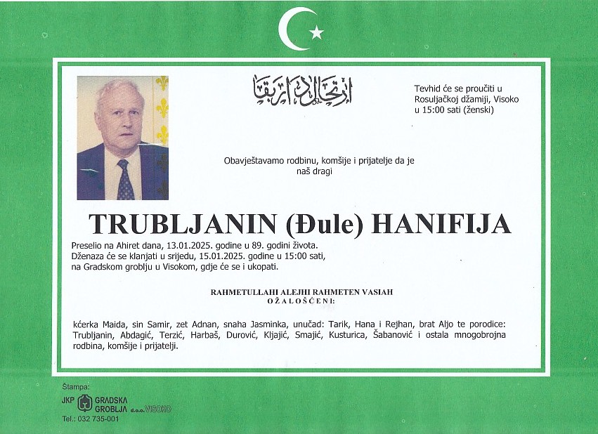 TRUBLJANIN (Đule) HANIFIJA 15.01.2025. godine u 15:00 sati