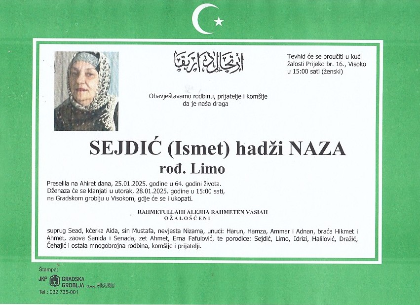 SEJDIĆ (Ismet) hadži NAZA 28.01.2025. godine u 15:00 sati