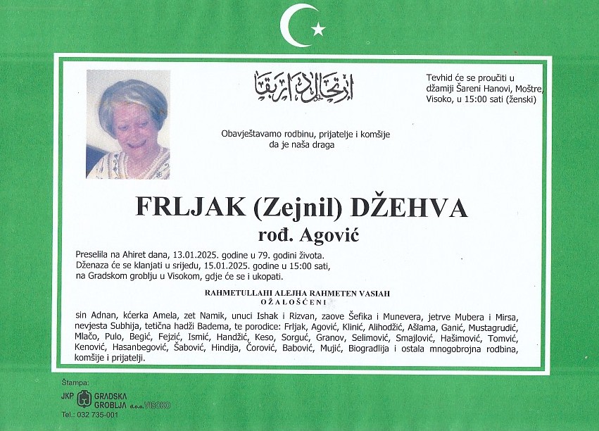 FRLJAK (Zejnil) DŽEHVA 15.01.2025. godine u 15:00 sati
