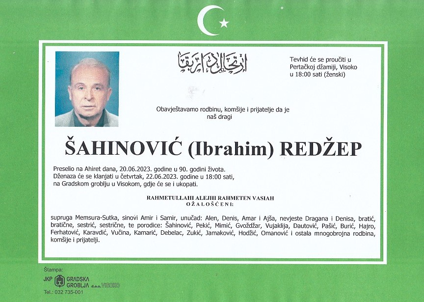 ŠAHINOVIĆ (Ibrahim) REDŽEP 22.06.2023. godine u 18:00 sati