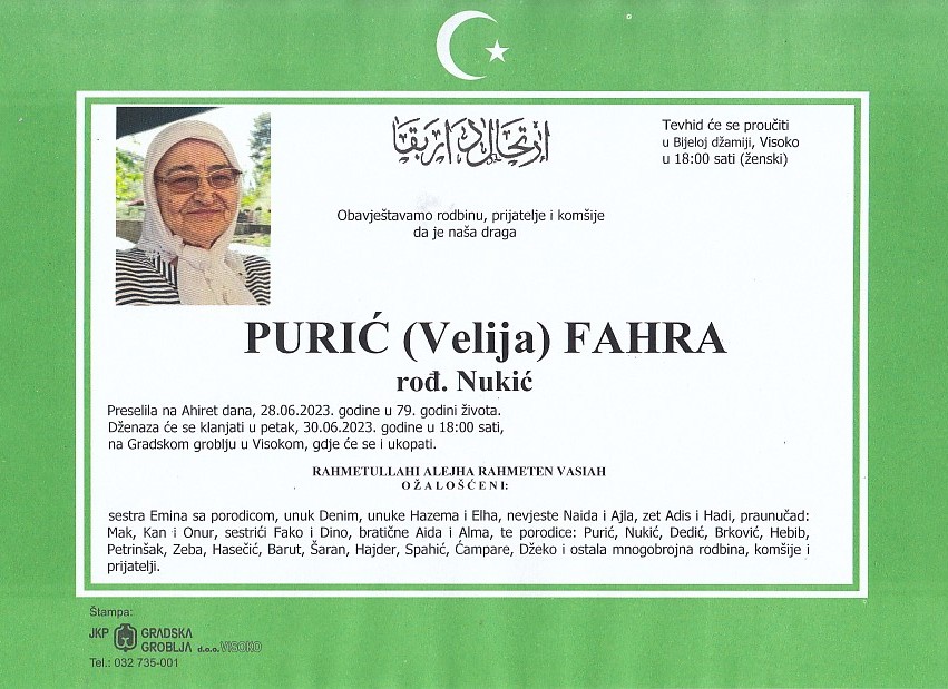 PURIĆ (Velija) FAHRA 30.06.2023. godine u 18:00 sati