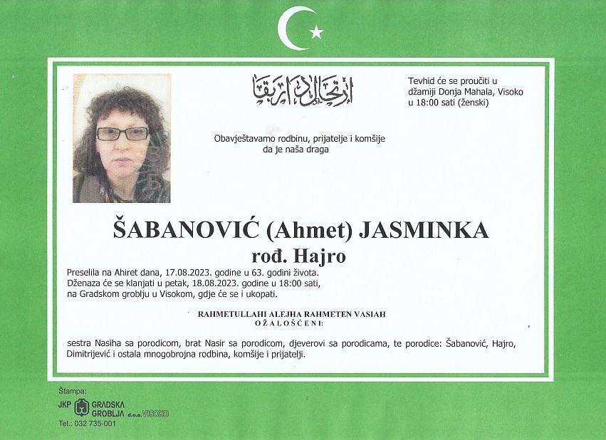 ŠABANOVIĆ (Ahmet) JASMINKA 18.08.2023. godine u 18:00 sati
