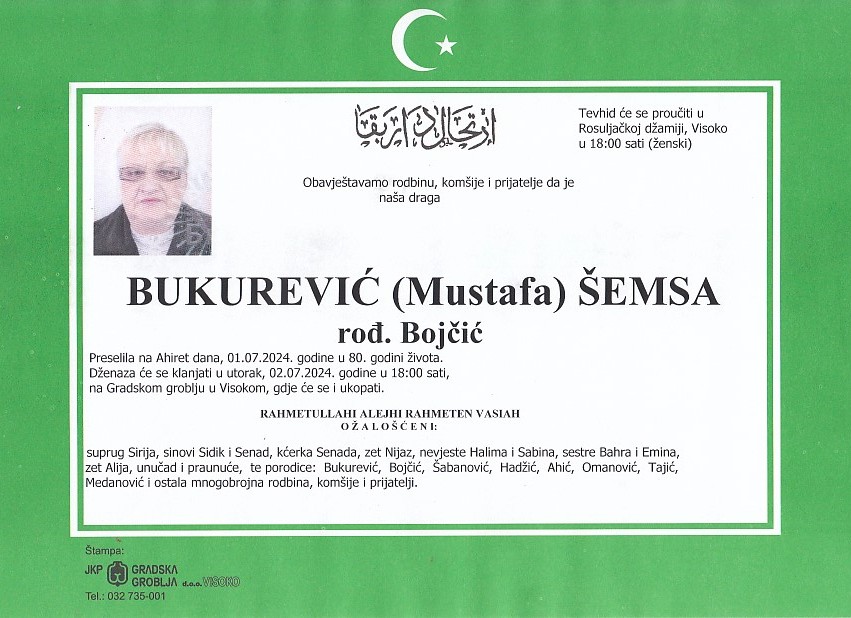 BUKUREVIĆ (Mustafa) ŠEMSA 02.07.2024. godine u 18:00 sati