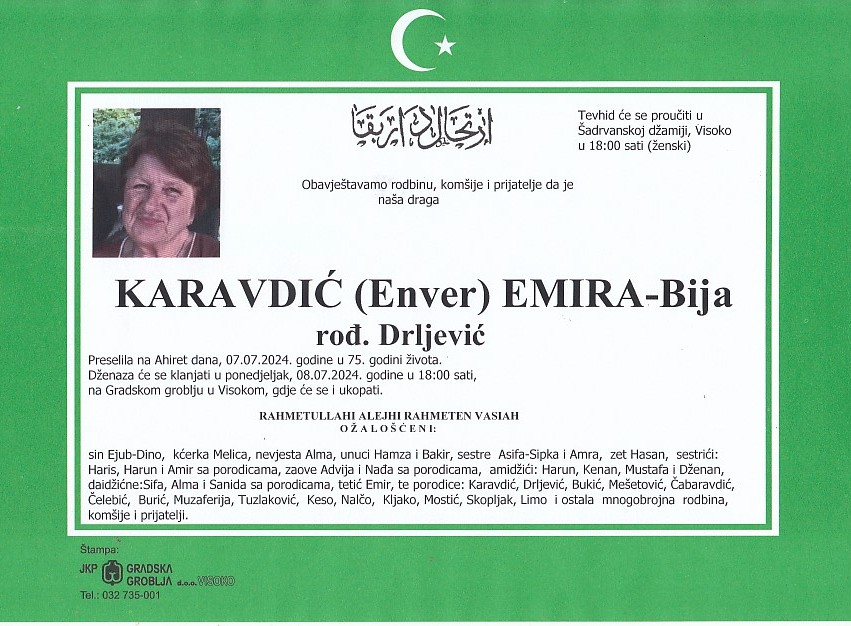 KARAVDIĆ (Enver) EMIRA 08.07.2024. godine u 18:00 sati