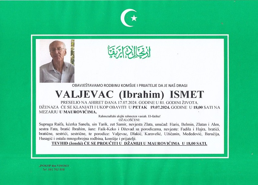 VALJEVAC (Ibrahim) ISMET 19.07.2024. godine u 18:00 sati