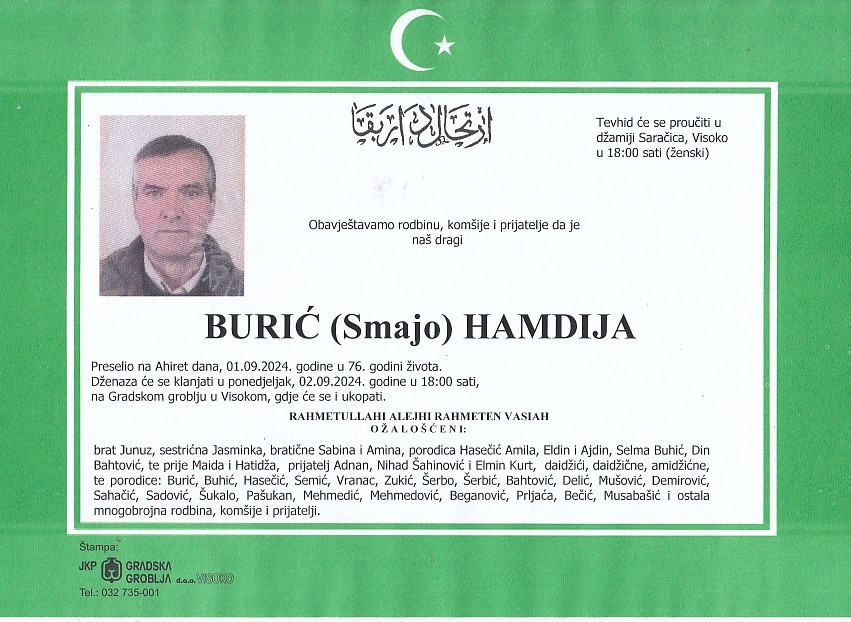 BURIĆ (Smajo) HAMDIJA 02.09.2024. godine u 18:00 sati