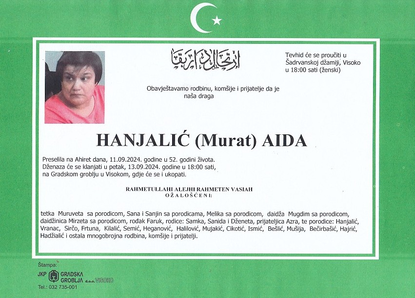 Prethodni članak: HANDŽIĆ (Hazim) NADŽIJA 13.09.2024. godine u 18:00 sati