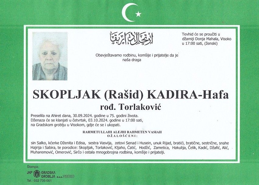 SKOPLJAK (Rašid) KADIRA 03.10.2024. godine u 17:00 sati