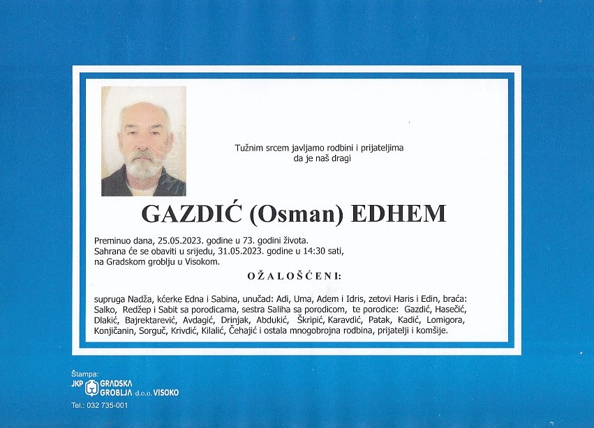 GAZDIĆ (Osman) EDHEM 31.05.2023. godine u 14:30 sati