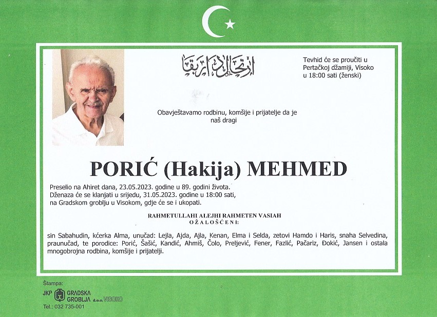 PORIĆ (Hakija) MEHMED 31.05.2023. godine u 18:00 sati