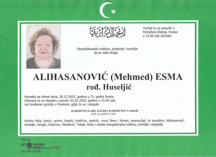 ALIHASANOVIĆ (Mehmed) ESMA 02.01.2024. godine u 15:00 sati