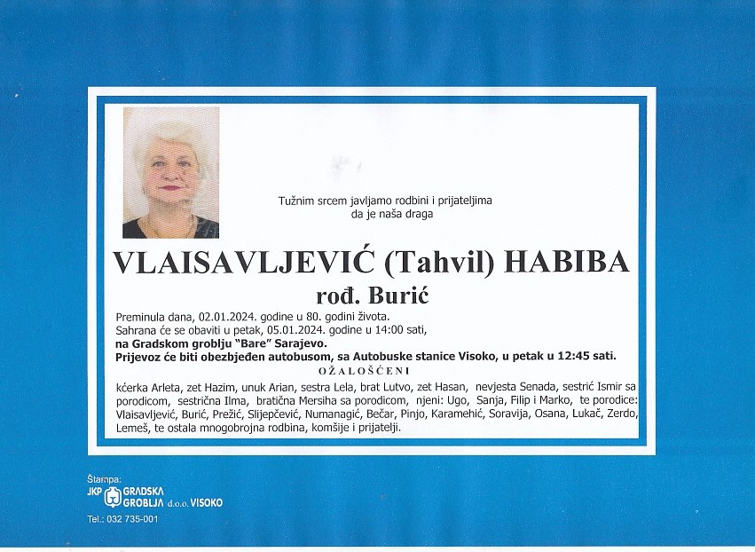 VLAISAVLJEVIĆ (Tahvil) HABIBA 05.01.2024. godine u 14:00 sati