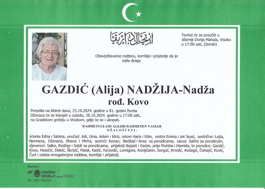 GAZDIĆ (Alija) NADŽIJA 26.10.2024. godine u 17:00 sati