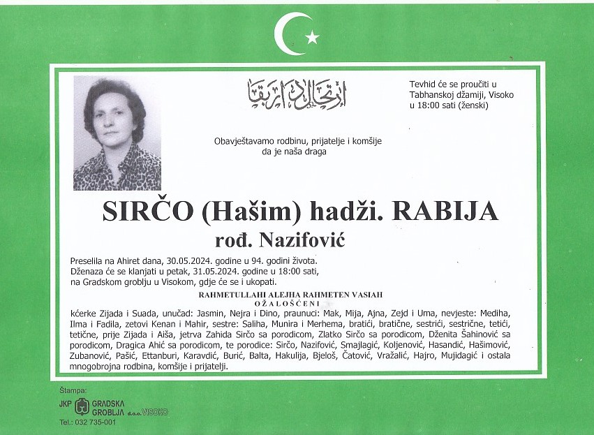 SIRČO (Hašim) RABIJA 31.05.2024. godine u 18:00 sati