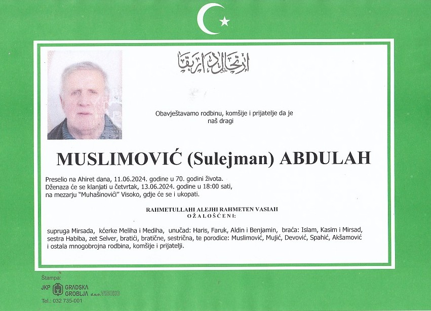 MUSLIMOVIĆ (Sulejman) ABDULAH 13.06.2024. godine u 18:00 sati