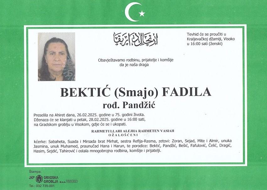 BEKTIĆ (Smajo) FADILA 28.02.2025. godine u 16:00 sati