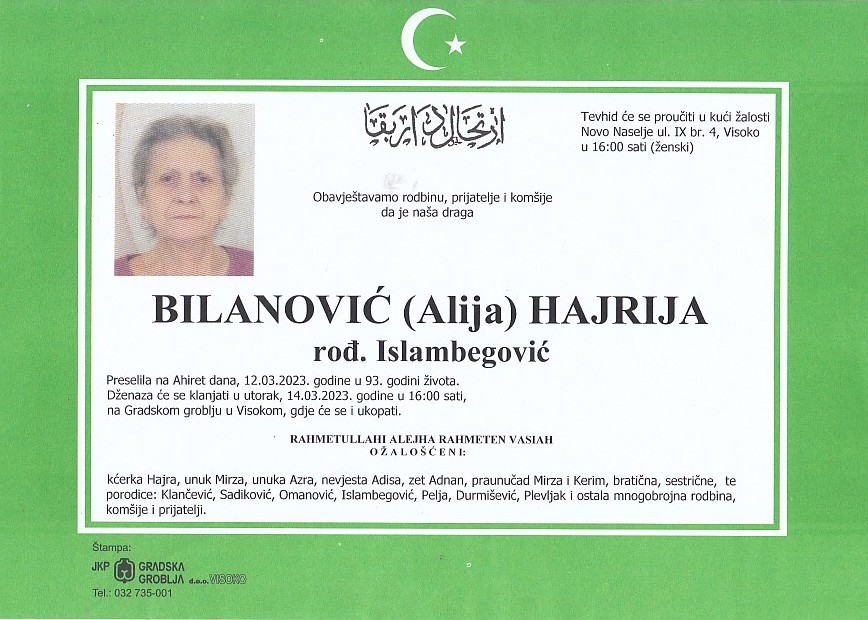 BILANOVIĆ (Alija) HAJRIJA 14.03.2023. godine u 16:00 sati