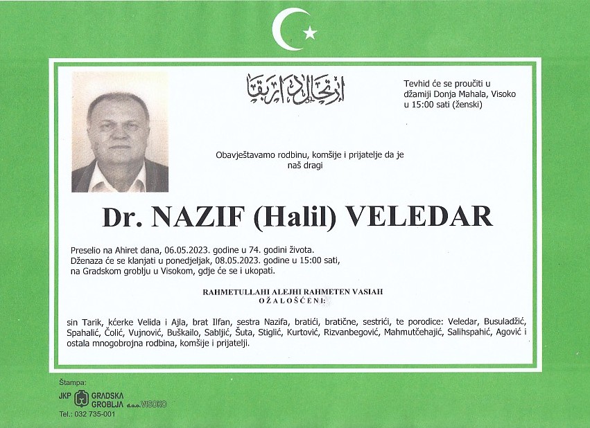 VELEDAR (Halil) NAZIF 08.05.2023. godine u 15:00 sati