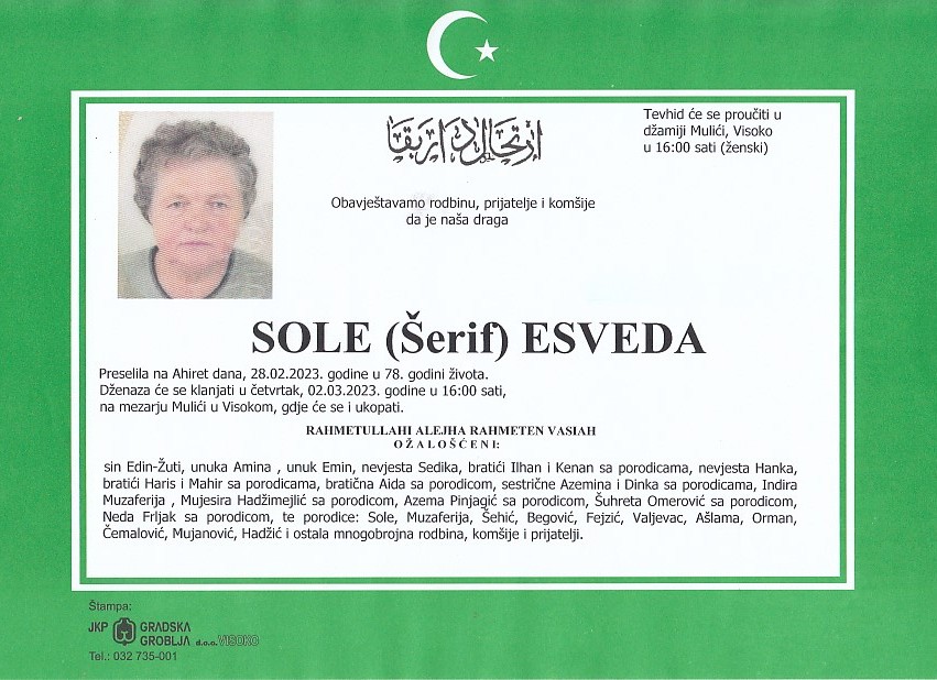 SOLE (Šerif) ESVEDA 02.03.2023. godine u 16:00 sati