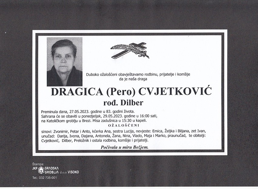 CVJETKOVIĆ (Pero) DRAGICA 29.05.2023. godine u 16:00 sati