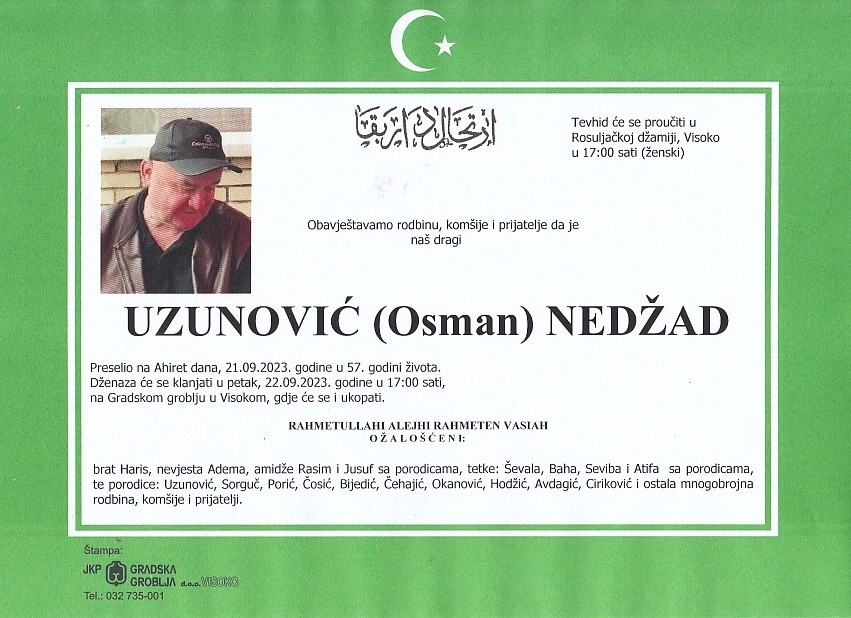UZUNOVIĆ (Osman) NEDŽAD 22.09.2023. godine u 17:00 sati