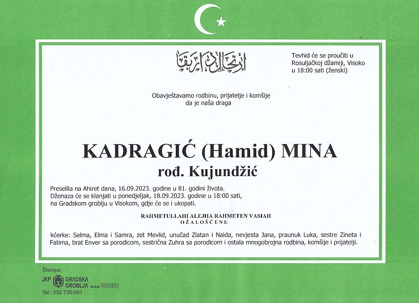 KADRAGIĆ (Hamid) MINA 18.09.2023. godine u 18:00 sati
