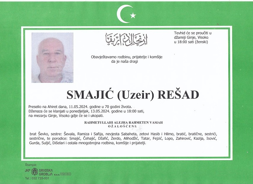 SMAJIĆ (Uzeir) REŠAD 13.05.2024. godine u 18:00 sati